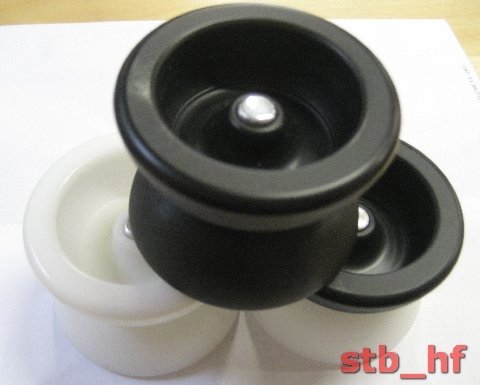 Scudi in Delrin con centraggio in alluminio inserito per interferenza cuscinetto Konkave by Frank. Sistema di ritorno: silicone auto livellante colato nelle cave all’interno degli scudi.